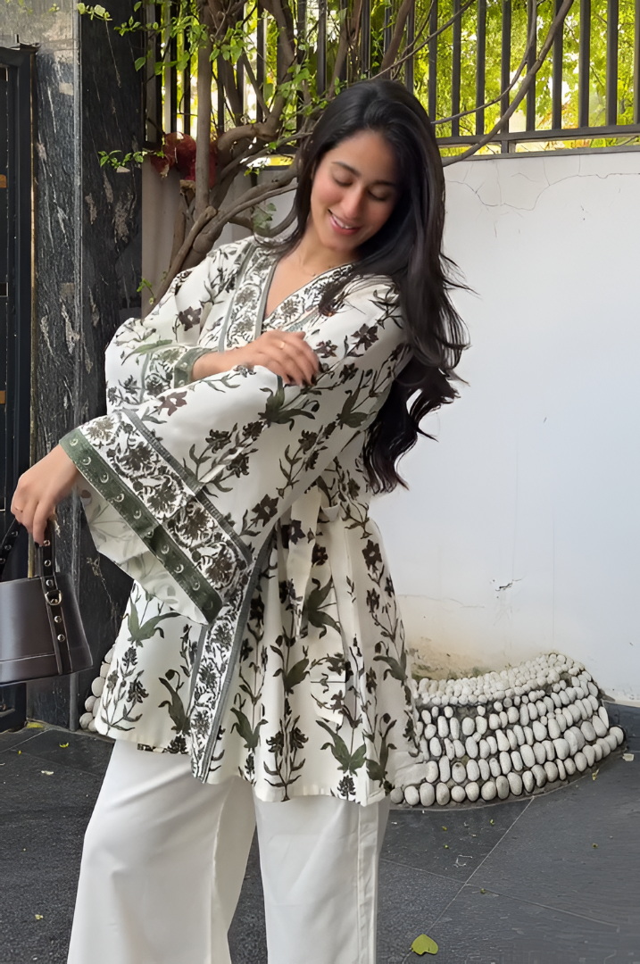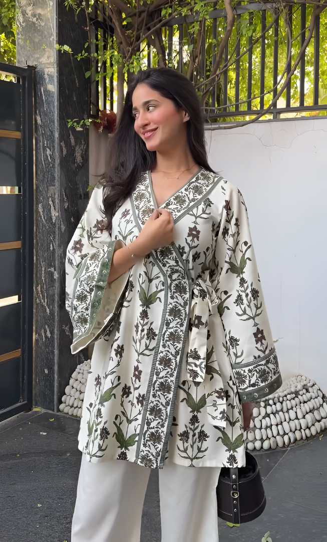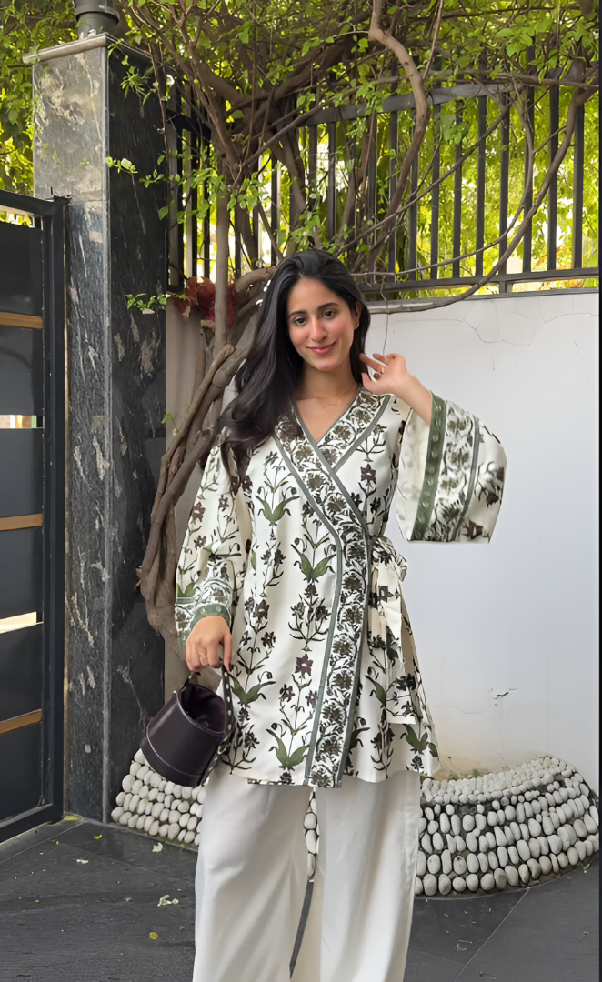 Botanical print kurta set features a relaxed kimono-style silhouette with wide sleeves and a flattering wrap-inspired neckline. The soft white base with olive and earthy floral prints gives it a sophisticated and minimal look.