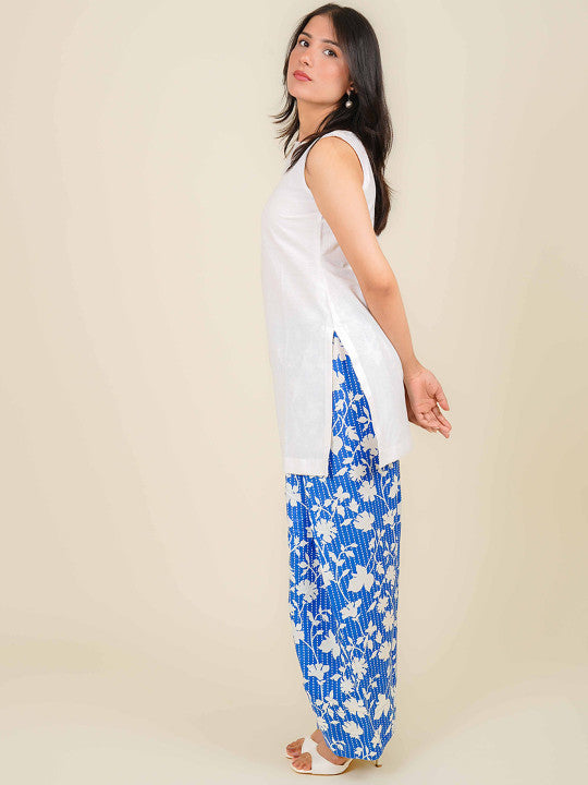 White Sleeveless Salwarset with Blue Floral Palazzo Set. Designed for modern women who love effortless style, this outfit combines simplicity with vibrant floral prints.